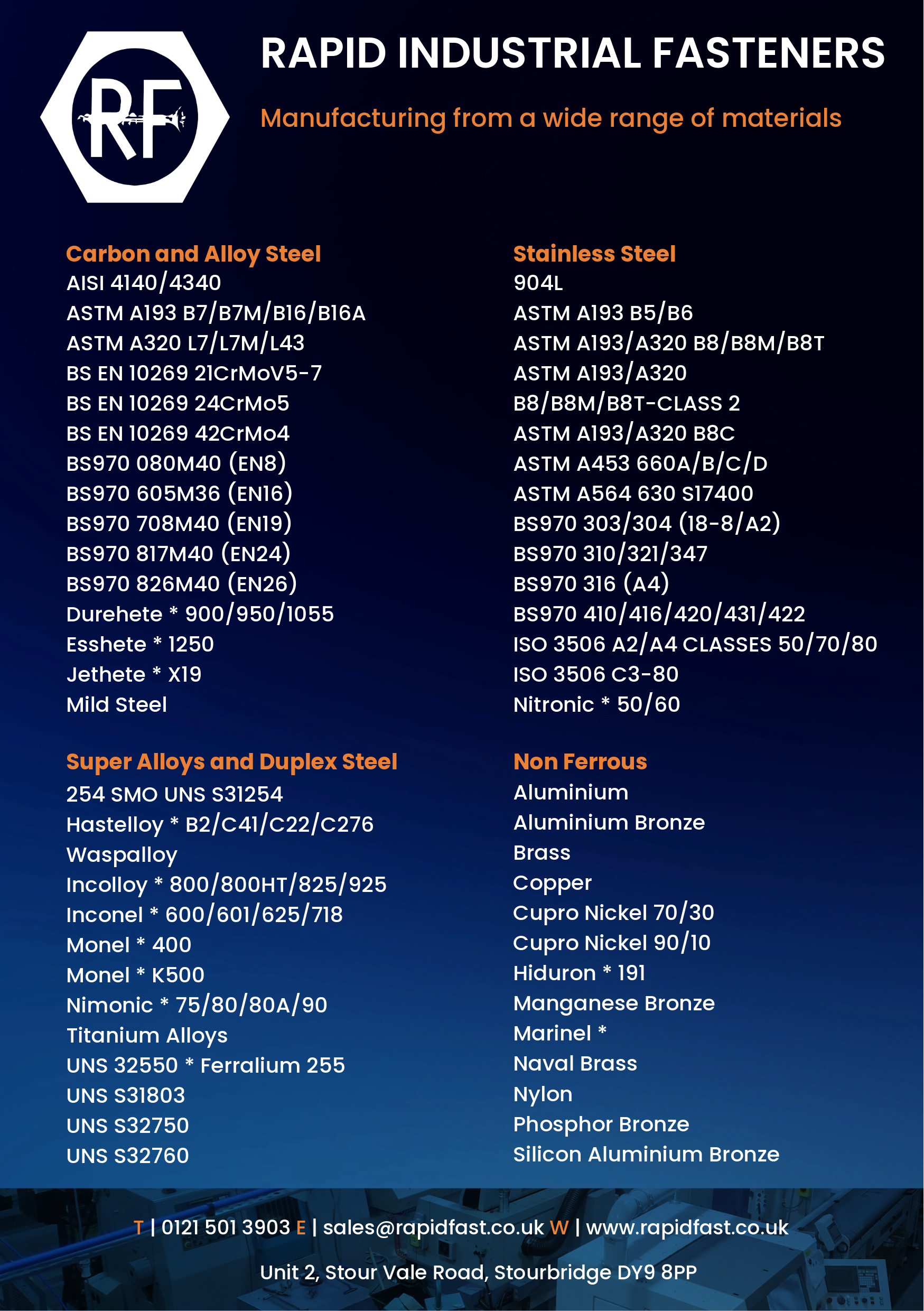In today’s demanding industrial landscape, selecting the right fastener material is critical to performance, safety, and longevity. Here at Rapid Industrial Fasteners, we specialise in manufacturing specialised fasteners and fixings from an extensive range of materials. Ensuring optimal solutions for aerospace, oil and gas, marine, power generation, and industrial applications worldwide.